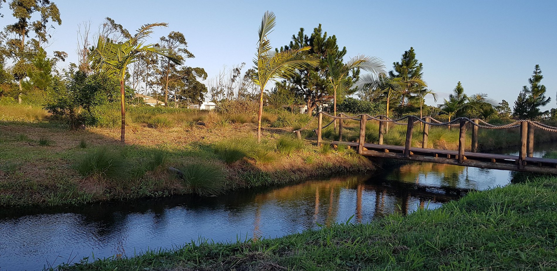 É um lugar muito tranquilo, seguro e de frente para uma área verde com um pequeno lago.